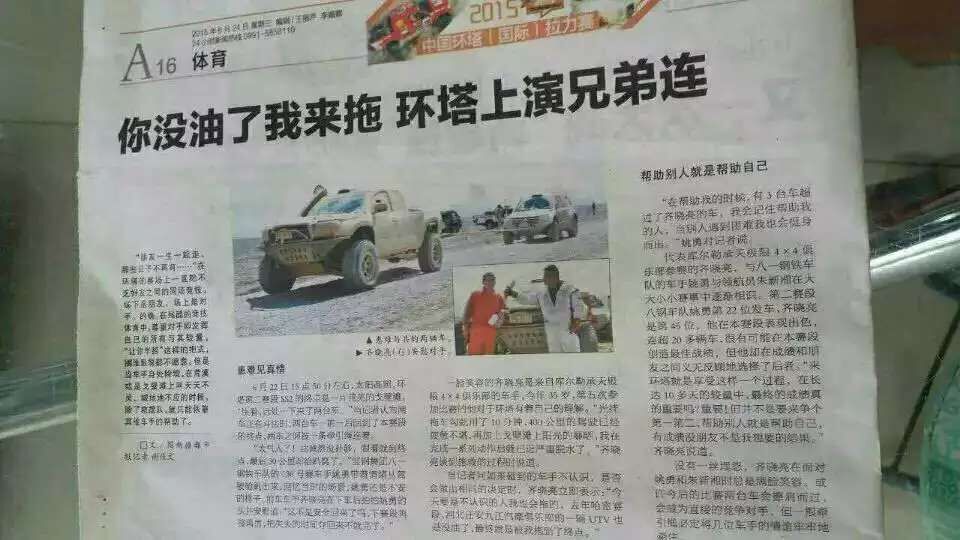 在環(huán)塔SS2賽段,來(lái)自金雪馳潤(rùn)滑油助力的庫(kù)爾勒承天極限4×4俱樂(lè)部車(chē)手齊曉亮,將半路沒(méi)油的八一鋼鐵車(chē)隊(duì)的130號(hào)賽車(chē)手安全“拖”出了沙漠,挺身而出、不計(jì)較個(gè)人成績(jī)的堅(jiān)毅品格,優(yōu)秀的越野精神,感染了整個(gè)環(huán)塔賽場(chǎng)...
