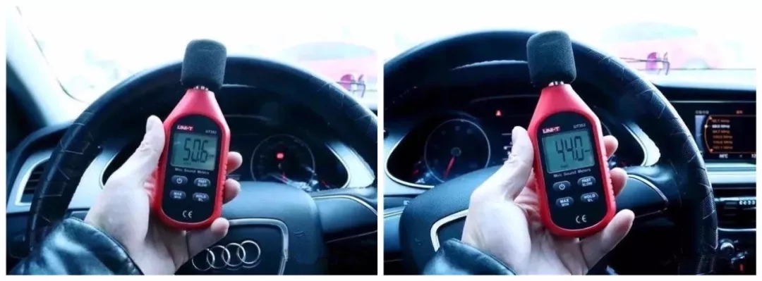 車輛怠速情況下, 更換前車內(nèi)噪音值為50.6分貝(左圖),更換后為44分貝(右圖),靜音效果顯著,這就相對(duì)于,前一秒您的車子里還有一臺(tái)洗衣機(jī)在工作,使用金1號(hào)后,車內(nèi)有個(gè)人在跟您輕聲聊天。