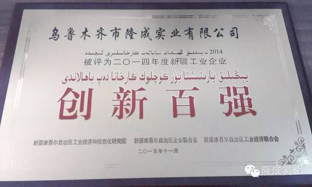 2015年12月4日,自治區(qū)經(jīng)信委召開新疆工業(yè)企業(yè)創(chuàng)新百強發(fā)布會,烏魯木齊市隆成實業(yè)有限公司榮膺“新疆工業(yè)企業(yè)創(chuàng)新百強”稱號。