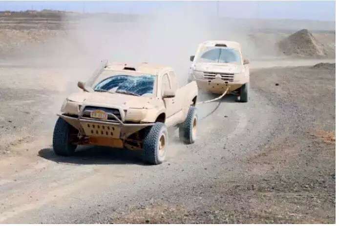 6月22日15點50分左右,太陽高照,環(huán)塔第二賽段SS2的終點是一片荒蕪的戈壁灘?!翱炜?,遠處一下來了兩臺車?!碑斢浾哒J為兩車正在斗法時,兩臺車一前一后回到了本賽段的終點,兩車之間被一條牽引繩連著。
