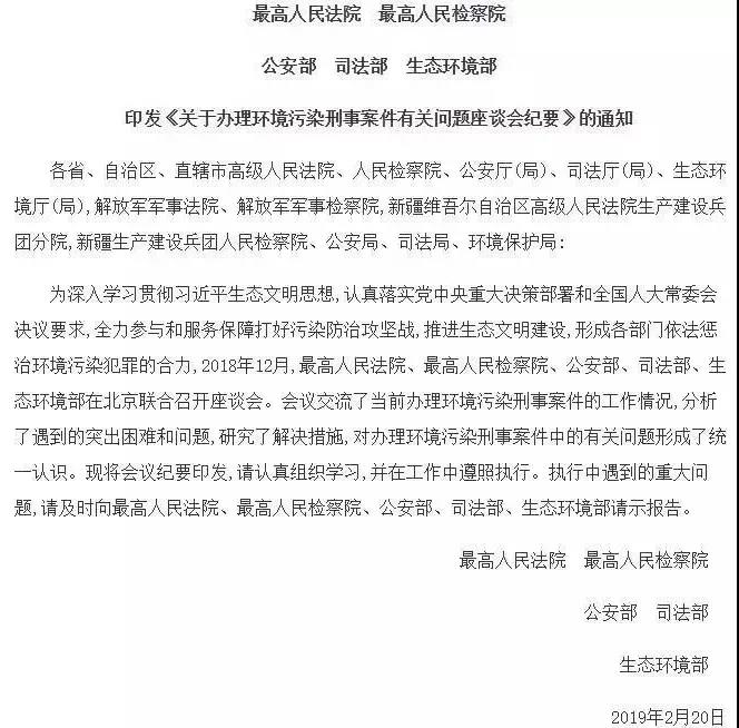 2月20日,為依法懲治環(huán)境污染違法犯罪活動,最高人民法院、最高人民檢察院、公安部、司法部、生態(tài)環(huán)境部聯(lián)合發(fā)布了《關(guān)于辦理環(huán)境污染刑事案件有關(guān)問題座談會紀要》,對當前辦理環(huán)境污染刑事案件中的重點難點問題作出回應(yīng)和規(guī)定。